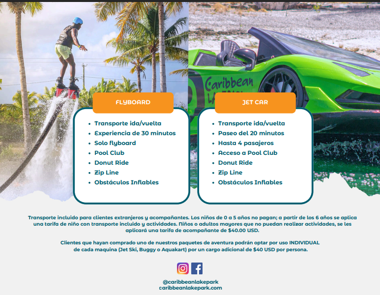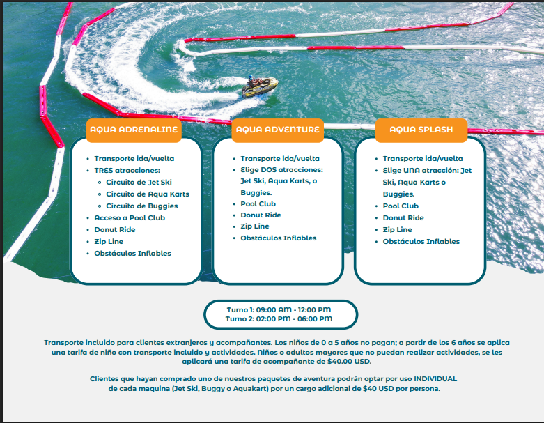 Transporte ida y vuelta desde cualquier hotel de la zona de Punta Cana, Bávaro o Uvero Alto Una actividad incluida: elegir entre Aqua Karts, Jet Ski o Buggies. Actividades adicionales: Pool Club, Donut Ride, Zipline y Circuito de Obstáculos Inflables. Acceso al Pool Club, Restaurante, Bar, Zonas Lounge y todas las amenidades del parque